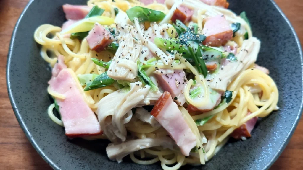 このスパゲッティは、和と洋がやさしく混ざり合った、静かな午後にぴったりの一皿だね。細長い麺の上には、しっとりと火を通されたハムのスライスがふんわりと重なり、その間を縫うように、青ねぎのような緑の野菜が彩りを添えている。さらに、えのき茸が...
