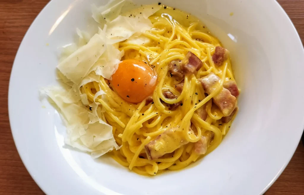 この一皿は、イタリアの伝統が息づく「カルボナーラ」。クリーミーで黄金色のソースがスパゲッティにやさしく絡み、卵とチーズのまろやかさが口いっぱいに広がるよ。カリッと焼かれたパンチェッタ(またはベーコン)が、香ばしさと塩気のアクセントになっ...