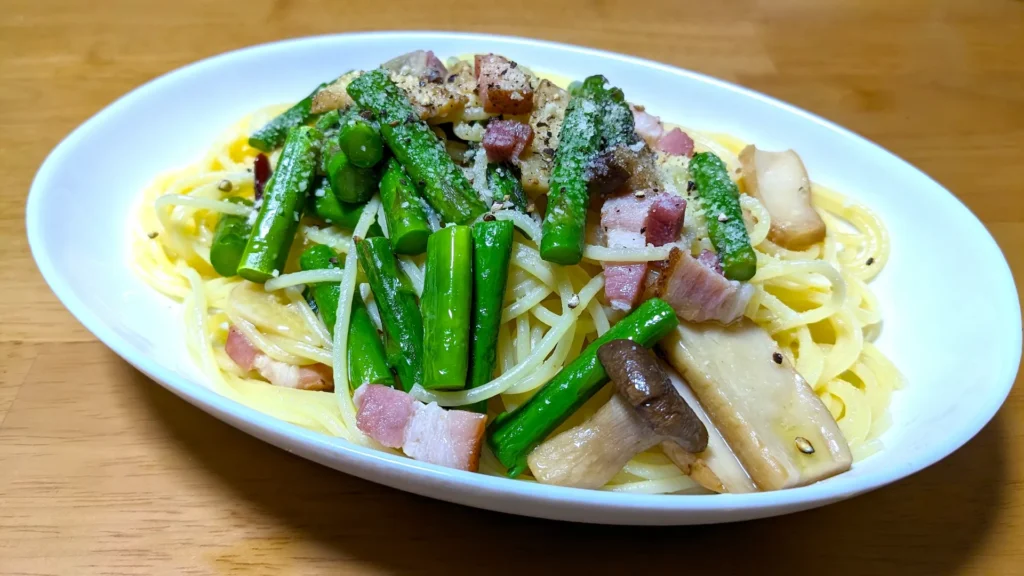 このスパゲッティは、彩り豊かで香ばしさと優しさが同居した一皿だね。白いオーバル皿に盛られたパスタは、クリーミーな色合いの中に、鮮やかなインゲンの緑が映えていて、まるで森の中に差し込む光のよう。カリッと焼かれたベーコン(またはパンチェッタ...