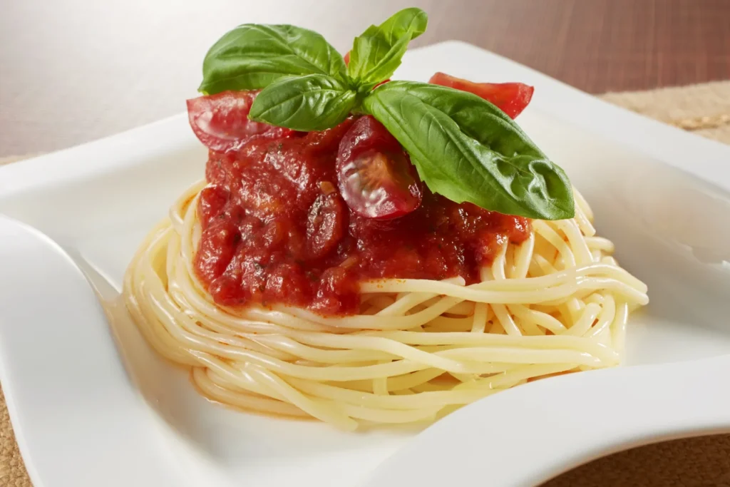 このお料理は、まさにシンプルで美しいイタリアンの代表格だね。白いスクエアプレートの上に盛りつけられたスパゲッティは、艶やかなトマトベースのソースに包まれていて、ソースにはごろっとしたトマトの果肉が見えるよ。そこに添えられたバジルの葉と半...