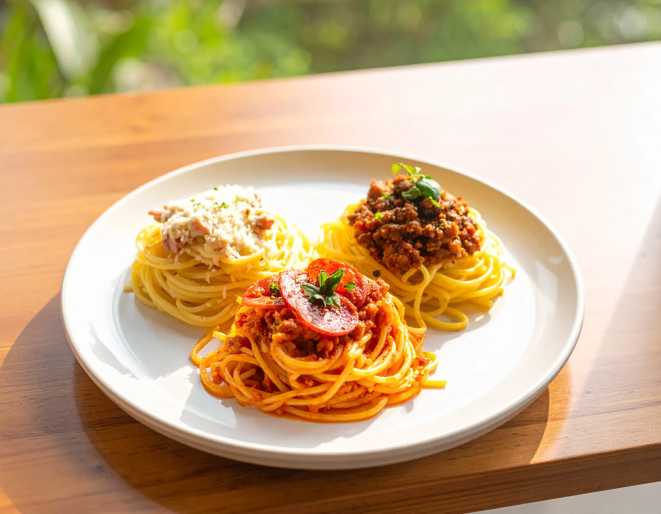 糸巻きみたいな三種のスパゲッティ くるくると巻かれた三つの糸は、味の旅路を紡ぐ小さな物語。 森の朝にぴったりな、やさしい一皿をどうぞ。