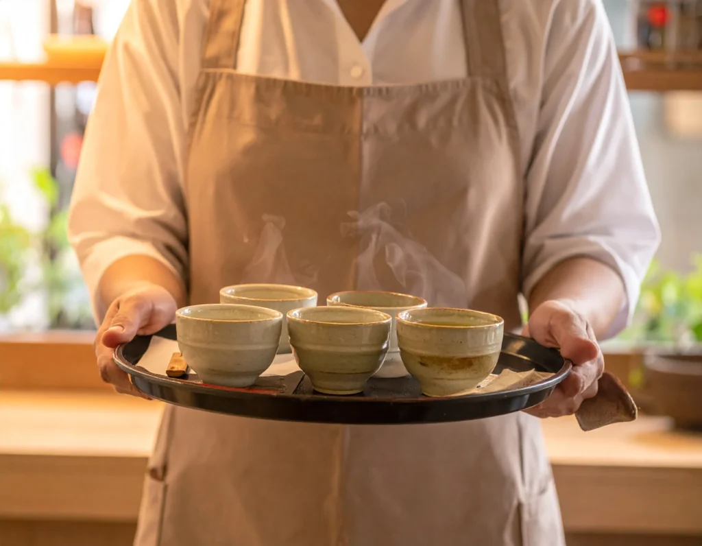 食後や待ち時間に、そっと添えられる一杯のお茶。 湯気がふわりと立ちのぼるその瞬間に、 空間のやさしさが、目に見えるかたちで広がります。